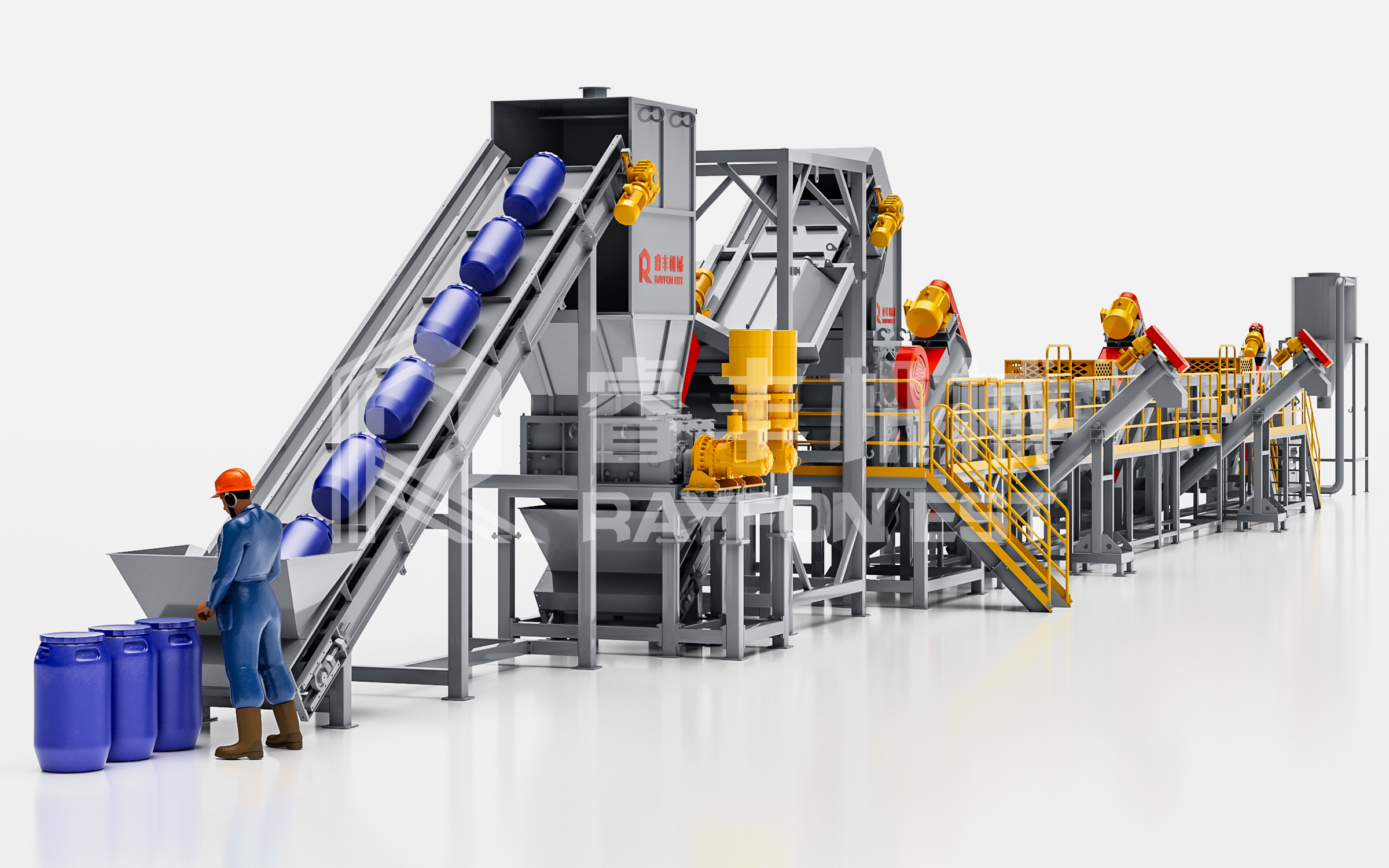 本生产线系统专为危废 HW49 类塑料包装容器的回收处置项目设计。根据《国家危险废物名录》的分类要求,工业领域常见的化工桶、化工罐、机油桶、机油壶等塑料包装容器,均属于 HW49 类工业危险废物,而非一般固体废物或工业垃圾。其收集、储存、运输及处置环节,必须严格遵循《中华人民共和国固体废物污染环境防治法》的相关规定。因此,本系统在工艺严谨性、整体密封性及全程零人工介入等方面,与传统固废垃圾处理方式存在本质区别。