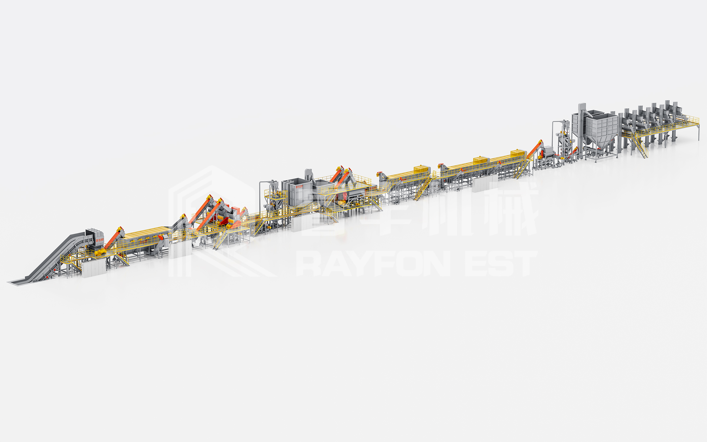 湖北睿丰科技从自成立之日就一直专注于废旧塑料的循环回收再利用项目的工艺设计及其生产线设备的研发制造;随着产品的不断改进升级,其整线设备的产能、电耗、水耗、成品耗损率、自动化程度等多方面性能指标在业界均有突出优势,在HDPE牛奶瓶、HDPE化工桶、PP机油壶等浮水硬塑料清洗线的清洗去油、去不干胶、除杂质、橡塑分离、纸塑分离、铝塑分离等市场难题上有相当丰富的经验,针对浮水硬胶去除不干胶、去油墨、油渍等方面匀有针对性处理工艺,采用撕碎机先撕碎,撕碎机过后上破碎机进行细破,然后进行强力摩擦机去油、去不干胶、除杂质。之后进入漂洗水槽中在漂洗出料环节采用滚筒反切线式挖料出料方法,其出料速度快、耗水低(滚筒为滤网镂空结构,物料中的水迅速回流至漂洗池中)、运行性能稳定维护成本低(独立电机驱动、变频调速);沉浮分离池底部装配有独立反螺旋,螺旋顶端装配大口径蝶阀,清理维护时只需要打开蝶阀,启动反螺旋,池底沉淀杂料等污渍自然排干净,无需人工深入池底清扫。大型漂洗池底部配置有多个锥形泄渣装置,当池底污渍或泥沙沉积过多时,只需打开泄渣阀即可单一的将池底部沉淀污渍及泥沙排出,无需更换整池水,大大节省漂洗用水量。同时绿丰机械可提供配套的污水循环过滤方案及设备,可以在确保在不影响清洗效果的前提下更高程度提升水循环回用比例,尽可能降低环保排放压力。